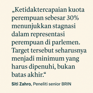 Selain itu, Siti Zahro, peneliti senior BRIN menyatakan “Ketidaktercapaian kuota perempuan sebesar 30% menunjukkan stagnasi dalam representasi perempuan di parlemen. Target tersebut seharusnya menjadi minimum yang harus dipenuhi, bukan batas akhir”.